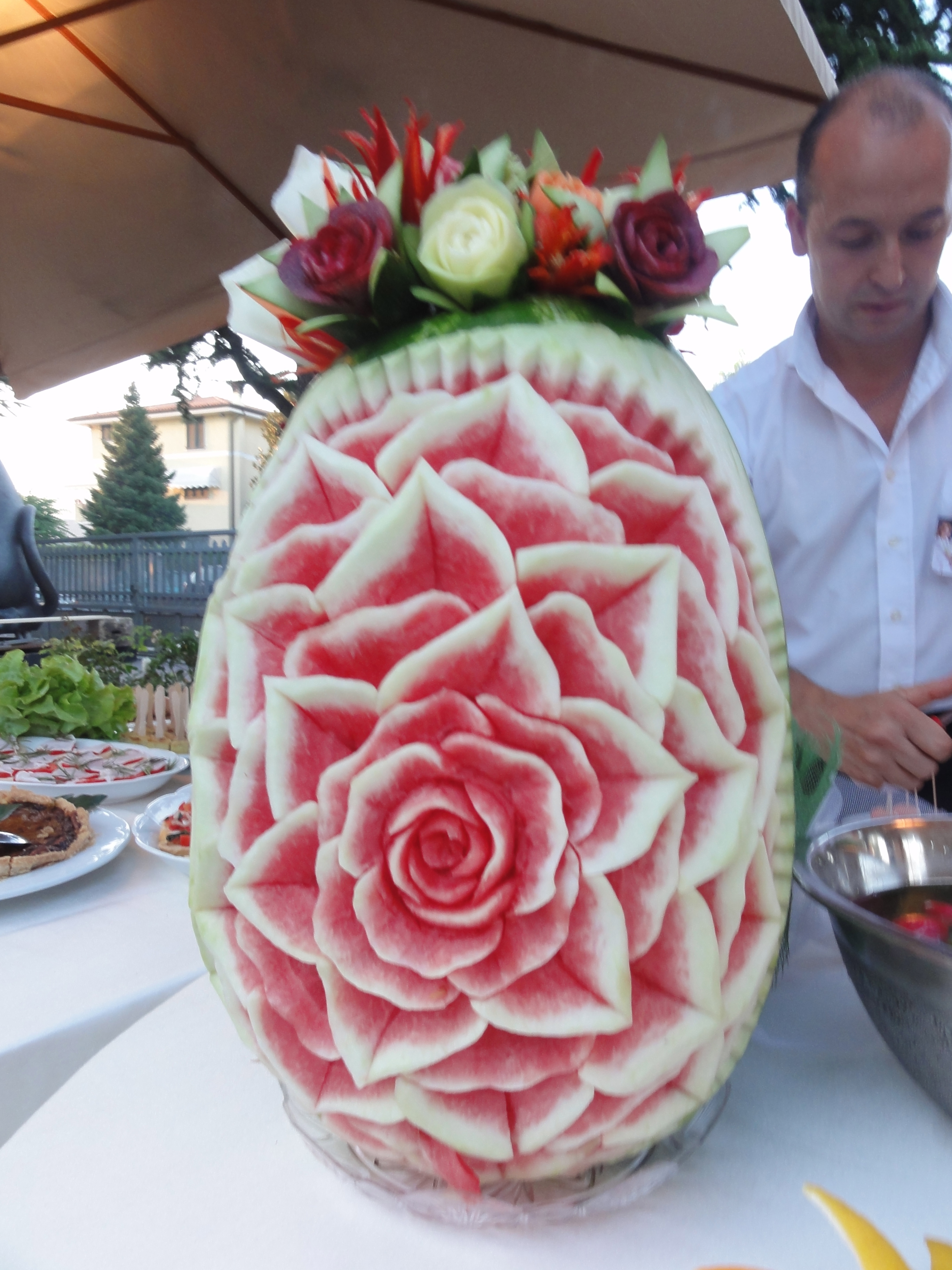 Watched as a young woman carved, sliced and chopped this massive watermelon or “cocomero” in Italian into this ornate beautiful flower design.